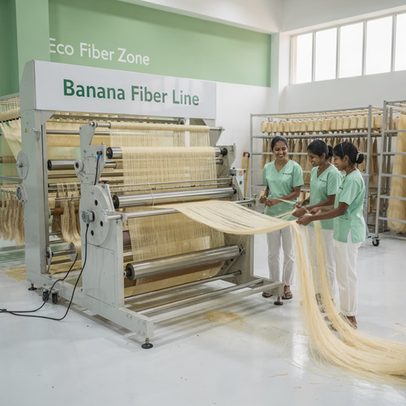 The outer layers of the stem are carefully stripped. Fibres are extracted using: Mechanical decortication (machine process) Or traditional hand-scraping methods The result is raw banana fibre — long, strong, and silky.